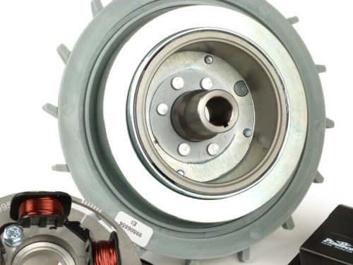Pinascos Flytech è un alternatore di scambio e accensione completo. Oltre ad una massa volanica inferiore, offre una regolazione dinamica della fasatura di accensione con un campo di regolazione di 8°. Ciò si traduce in un comportamento di accelerazione significativamente migliore e in una maggiore affidabilità operativa grazie all'angolo di accensione che si riduce con l'aumentare della velocità. Le pale del ventilatore più piccole con profilo ricalcolato consentono un notevole e misurabile aumento delle prestazioni senza ridurre la capacità di raffreddamento nella gamma di velocità superiore. Rispetto ad un'accensione Vespatronic o Vespower, il nucleo magnetico del Flytech è sigillato con una lastra di metallo stabile. Questo protegge la piastra di base e le bobine di accensione da danni in caso di rottura del magnete. L'accensione è dotata di una filettatura di trascinamento in quanto utilizzata nel rotore originale. L'ambito di fornitura contiene: Volano (rotore con ventilatore) Piastra di base con unità di accensione (statore) CDI con anticipo di accensione cavo di accensione regolatore di tensione Cavo di terra Istruzioni di montaggio in italiano e inglese NOTA: Per rimuovere il rotore/volano è necessario un supporto a 2 pin. Consigliamo il nostro versatile utensile di presa BGM8801 (vedi anche accessori) AI-translation