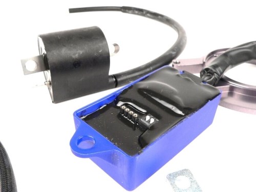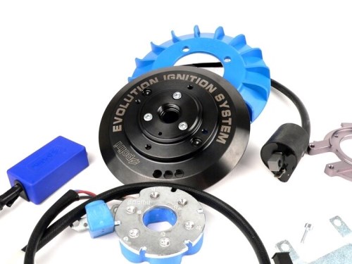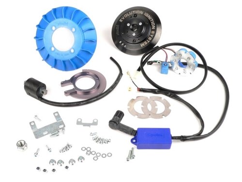 Per la prima volta Polini offre con la sua accensione digitale da corsa una vera alternativa alle accensioni Vespatronic, già presenti sul mercato da tempo: a differenza del Vespatronic, qui non è stata adattata nessuna accensione convenzionale della gamma automatica, ma è stata utilizzata una piastra di base completamente fusa. Il leggerissimo volano, del peso di soli 1100 grammi, è dotato di un ventilatore in plastica facilmente intercambiabile con geometria ottimizzata della ruota a pale. Le pale sono state progettate per fornire sufficiente aria di raffreddamento al cilindro anche ai soliti alti regimi di un motore da corsa. La particolarità dell'accensione Polini che la distingue da tutte le altre versioni sul mercato è il suo modulo digitale con quattro diverse curve di fasatura programmate al suo interno, accessibili attraverso due DIP switch, che danno la possibilità di regolare la fasatura in base alle caratteristiche del motore. Tipicamente per i motori a due tempi, il motore parte con un alto valore di pre-accensione che viene poi ridotto all'aumentare del numero di giri e della potenza. L'intero campo di regolazione corrisponde a max. 10° KW (MAP 4). Sono disponibili le seguenti gamme: MAP1 (entrambi gli interruttori in posizione off): potenza nominale tra 9000-10000 giri/min. MAP2 (interruttore 1 on, interruttore 2 off): Potenza nominale tra 8000-9500 giri/min. MAP3 (interruttore 1 spento, interruttore 2 acceso): Potenza nominale tra 7500-8500 giri/min. MAP4 (entrambi gli interruttori in posizione on): potenza nominale tra 11000-12000 rpm La preaccensione è impostata a 23°, misurata a 4500 giri/min. Ciò corrisponde a 2,6 mm a 51 mm di corsa, e 2,7 mm prima del punto morto superiore per l'albero utilizzato da Polini per il kit di cilindri EVO a membrana con corsa 52,8 mm. La distanza tra l'accensione e la ruota polare, così come il pick-up, deve essere calibrata individualmente su ogni motore. Sono necessarie piccole modifiche all'alloggiamento del motore. Per ulteriori dettagli si prega di consultare il manuale allegato. Accensione Real High End che richiede attenzione ai dettagli durante il montaggio, ma è anche una base solida e affidabile per i veri motori da corsa. Adatto per motori con cono dell'alternatore da 20 mm. NOTA: Richiede un estrattore per ruota palo M22x1,5mm (vedi accessori). AI-translation