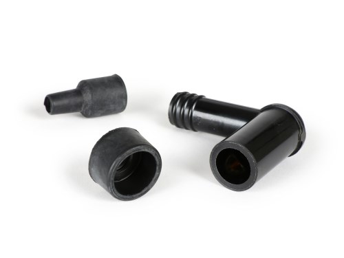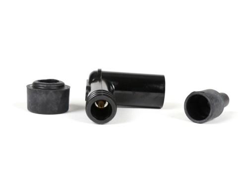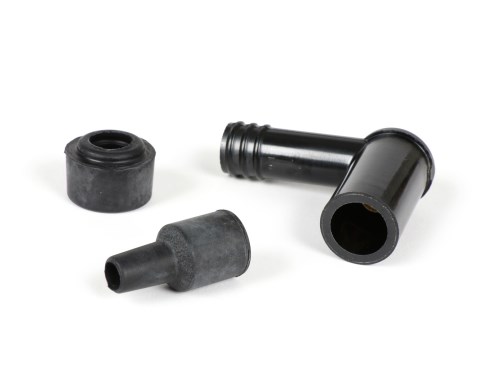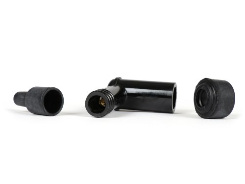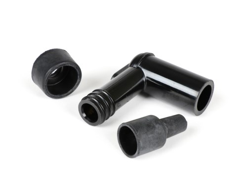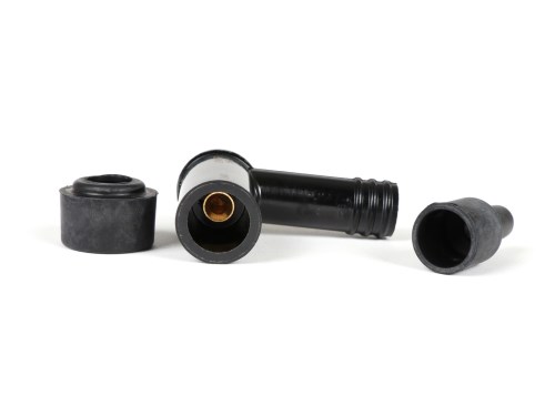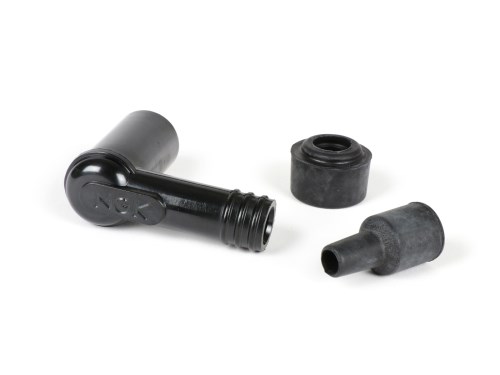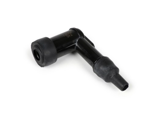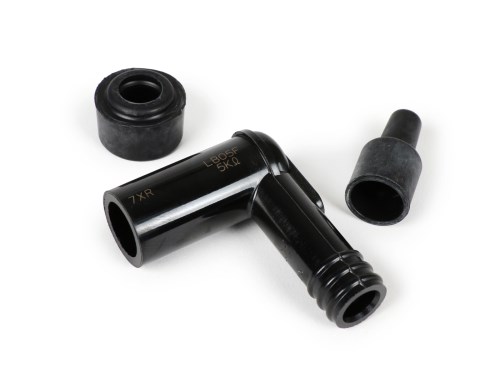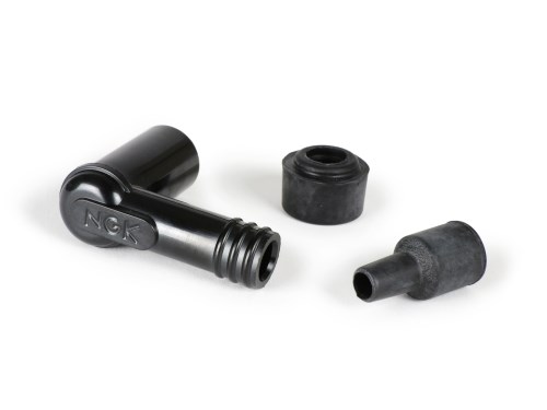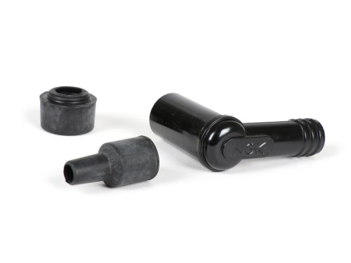Connettore per candele di accensione NGK Standard LD05F per tutte le candele di accensione con filettatura M10 e M12. Utilizzato sulla testa della Lambretta MMW e sulle teste Kübler. Le prese per candele di accensione NGK sono dotate di un elemento di resistenza di 5 kiloohm in materiale ceramico di alta qualità. La lunghezza perfettamente progettata impedisce in modo affidabile il flashover interno della scintilla di accensione e garantisce un valore di resistenza costante con solo una leggera deviazione in condizioni di sovraccarico. La custodia è realizzata in robusta resina fenolica con un'ottima resistenza al calore e alle sollecitazioni di trazione. Speciali manicotti di gomma ad entrambe le estremità impediscono le perdite elettriche causate dall'umidità. AI-translation