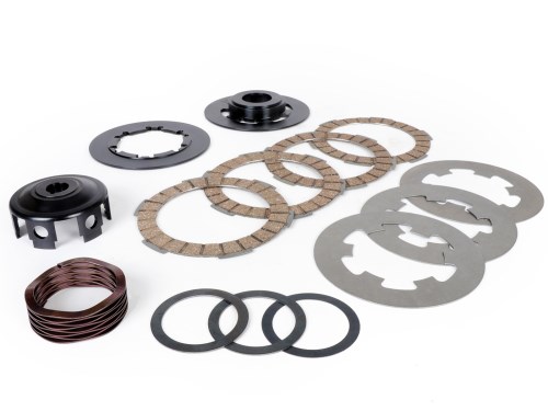 Sportkupplung Rennkupplung von Polini mit neuartiger Zentralfeder für Vespa Smallframe V50, PV, ET3, PK Polini bietet zwei neue Kupplungstypen (for race/evolution) für die beliebten Vespa Smallframemodelle an: FOR RACE: 4-SCHEIBEN Kupplung mit Wellenfeder, 4 Korkbeläge (je 1,9mm), 3 beschichtet Stahlscheiben (je 1mm) für Motoren bis 15PS EVOLUTION: 4-SCHEIBEN Kupplung mit Wellenfeder, 4 Sinterbeläge (je 1,9mm), 3 beschichtet Stahlscheiben (je 1mm) für Motoren über 15PS Beide verwenden eine neuartige Flachdrahtwellenfeder. Diese bietet gegenüber der, bislang von Polini verwendeten, konventionellen Spiralfeder viele Vorteile. Die Wellenfeder kippt nicht einseitig wie eine Spiralfeder, wodurch die Beläge immer gerade laufen und sauber voneinander trennen können. Zudem ist sie im direkten Vergleich leichter zu betätigen (bei gleichem Anpressdruck der Beläge). Das macht sie ideal für die Anwendung in einer Smallframekupplung und modernisiert das Zentralfederprinzip wie Piaggio es einst ab Werk verwendet hat. Der Anpressdruck der Feder kann mit, im Lieferumfang der Polini Kupplungen enthaltenen, Distanzscheiben auf 200kg erhöht werden. Die Kupplungsspinne samt Grundplatte und Deckscheibe sind aus nitriertem Stahl und somit belastbarer als Serienteile. Die Grundplatte verfügt über eine im Durchmesser größere Federaufnahme. HINWEIS: Die in den Kupplungssets enthaltene Feder ist nicht die gleiche wie die einzeln erhältliche Polini Wellenfeder für die Standard Kupplungen. Die im for race oder evo Kit enthaltene Feder ist kürzer (dadurch härter) und verfügt über einen größeren Aussendurchmesser.