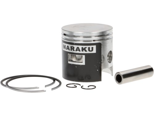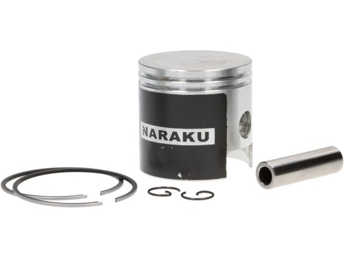 Il Naraku 85 cc è una versione ingrandita del cilindro Naraku 75 cc con un alesaggio di 50 mm. Per l'impiego nei tre ruote Piaggio APE50, tuttavia, è stato ribassato di 1 mm alla base del cilindro rispetto al Naraku 75 e la stessa dimensione è stata lasciata sul bordo superiore del cilindro. Gli angoli di fasatura sono stati ridotti a 152°/98° (scarico/tracimazione) per consentire al cilindro di fornire assistenza ancora prima nell'intervallo di giri. Non ci si può quindi aspettare un miglioramento dell'accelerazione su una Vespa V50/PK con il cambio originale rispetto a un Naraku 75, poiché il cilindro raggiunge molto rapidamente la fine dei suoi giri. Le marce devono essere cambiate rapidamente per ottenere un'accelerazione ragionevolmente accettabile. Tuttavia, questa caratteristica può essere sfruttata bene con un rapporto di trasmissione allungato per trasformare un cinquantino in un tourer di lunga durata. Utilizzando una primaria più lunga (3,00), un carburatore e un collettore di aspirazione da 19/19 mm, il cilindro con rapporto di compressione di 10,7:1 funziona molto bene con lo scarico a banana ad alta coppia di BGM (BGM Touring) o con una banana originale. I modelli PK possono benissimo continuare a utilizzare lo scarico originale se non è cotto. Dopo la regolazione obbligatoria del getto (getto principale min.74), il controllo della preaccensione (viene mantenuta la preaccensione standard di 19°) e l'utilizzo della candela con il valore termico corretto NGK B8HS o Bosch W4AC), è stato realizzato un pacchetto touring duraturo e potente .CONSIGLIO: montare sempre le fasce elastiche con attenzione. Alcuni pistoni sono dotati di fasce elastiche con profilo trapezoidale (le cosiddette fasce trapezoidali), che si adattano solo a una posizione di montaggio. Se l'anello non si muove liberamente, allentarlo con cautela e rimontarlo "al contrario". TUNINGTIP: è sufficiente sollevare il cilindro con un distanziale di 1 mm e ruotare il cilindro della stessa misura sulla superficie di tenuta superiore. In questo modo gli angoli di controllo vengono portati allo stesso livello del Naraku 75, rendendo il cilindro molto più reattivo . Traduzione AI