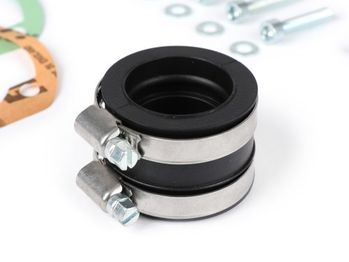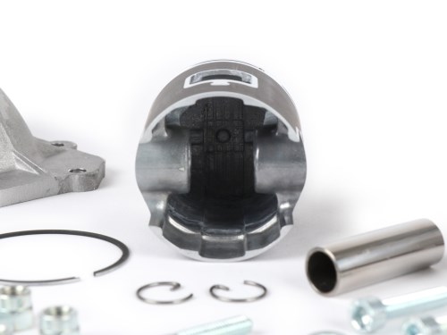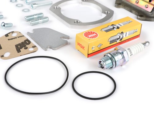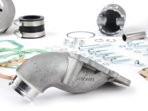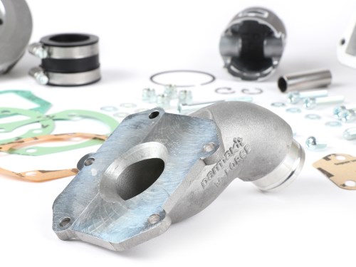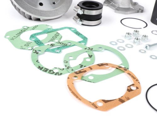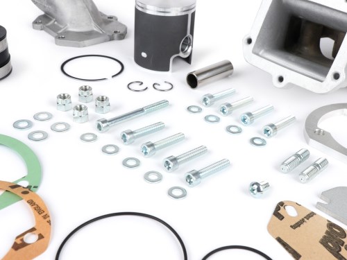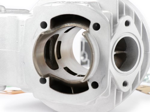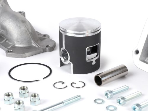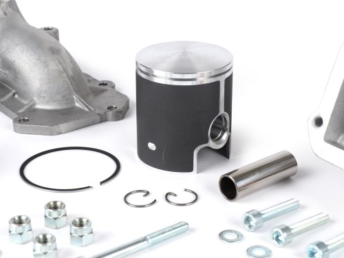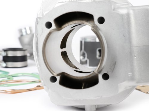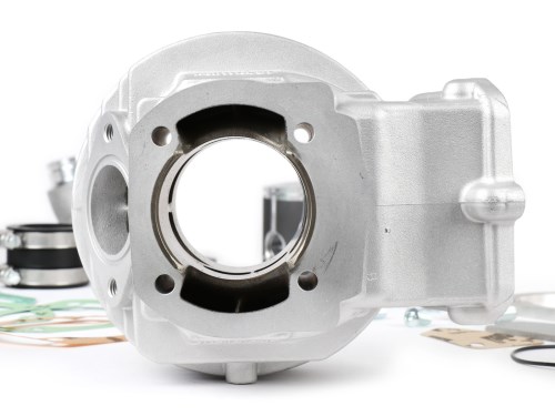 Cilindro da corsa Parmakit 121cc con ingresso a diaframma per PV125, ET3, PK125, ETS - patente A1/B196 (11kW/15PS) Il cilindro Parmakit 121cc è la versione ridotta dei brutalmente forti cilindri W-force 135/144cc. Grazie all'ingresso diretto a diaframma fuso sul cilindro, il controllo dell'ingresso è completamente indipendente dall'ingresso della cassa del motore, altrimenti dominante. Il cilindro ha superfici di lavaggio molto grandi così come gli angoli di controllo che sono concepiti per lo scopo di applicazione molto sportiva. Un tale cilindro in assetto da corsa completa rende vagamente oltre 20 CV al volante, con una gamma di velocità a partire da circa 6000 rpm. Se volete testare gli 11kW/15HP consentiti dal legislatore, per mantenere il motore conforme al regolamento A1 o B196 della patente attuale, questo è anche il posto giusto. Il cilindro può essere tagliato ad un livello di velocità inferiore con uno scarico un po' più mansueto. Questo non supera la potenza massima consentita e di solito migliora anche la guidabilità, grazie ad una coppia anticipata. Dalla concezione di base, tuttavia, il cilindro non può negare il suo design. Quindi bisogna fare i conti con varie modifiche alla cassa del motore (piallatura della superficie di tenuta della base del cilindro) e se necessario al telaio (apertura per il collettore di aspirazione). Corsa: 51mm Alesaggio: Ø55mm Doppia testa cilindrica ghiandola centrata camera di combustione calotta AI-translation
