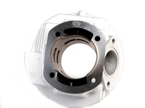 Cilindro da 135cc di Parmakit con base in alluminio ultra duro rivestito. Brevi fatti: Foro: 58mm Corsa:51mm Spostamento:135cc lunghezza della biella:97mm Posizione della candela: laterale Testa del cilindro: due pezzi pistone: forgiato Diametro della flangia di scarico: 36mm distanza bullone prigioniero: 62mm Mandrini richiesti: sì Forma dell'uscita: ovale, senza barra Rispetto alle versioni normali, i cilindri EVO hanno un pistone forgiato per impieghi gravosi, e con 1 mm di diametro in più nel foro, hanno anche una maggiore cilindrata. Equipaggiato con i componenti giusti, un cilindro di questo tipo eroga già oltre 20 CV a meno di 10000 giri/min. La "C" nel nome della cucina parmigiana sta per Classic, che si riferisce alla porta di scarico dal design convenzionale. Rispetto al normale cilindro EVO (senza "C"), questo è prodotto senza ponte al centro dello scarico. L'alloggiamento del motore deve essere esteso a 63 mm nel diametro del supporto della base del cilindro per il montaggio del cilindro. A causa della grande sezione trasversale dell'uscita e della conseguente grande distanza tra i perni dell'uscita di 62 mm, è possibile utilizzare solo sistemi di scarico idonei. Conclusione: cilindro estremamente potente con uscita ovale. AI-translation