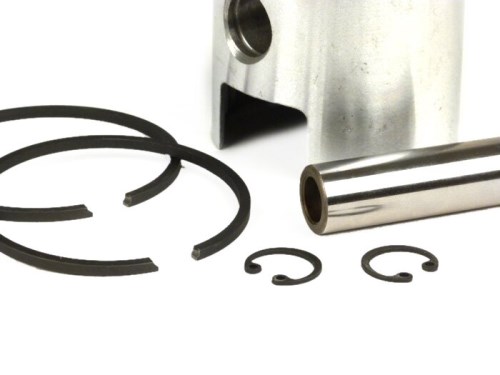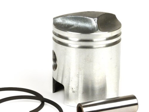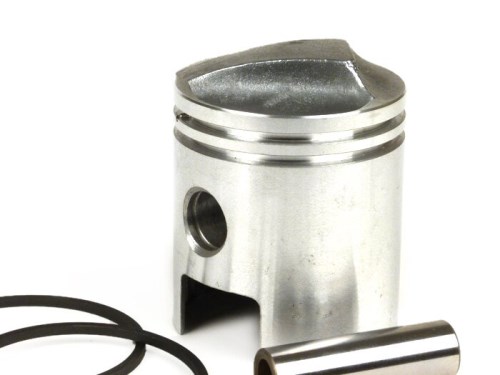 Pistone - VESPA Naso Pistone- Vespa ACMA 150ccm (Anno 1955-1958) Pistone di ricambio per i cilindri 150ccm della Vespa ACMA (1955-1958) - 58,5 mm è la dimensione standard. I pistoni a naso sono usati nei motori a due tempi a flusso incrociato per mantenere il flusso di gas fresco lontano dallo scarico aperto. Il naso si trova sulla corona del pistone e devia il flusso di gas verso l'alto. La sezione d'ingresso può essere più grande che nei motori a flusso incrociato con pistoni piatti. I pistoni a naso, inoltre, non possono impedire la fuoriuscita di gas fresco nello scarico a tutti i carichi e velocità, e causano una forma sfavorevole della camera di combustione. Dopo che il reverse scavenging è stato sviluppato negli anni '20, i motori a scoppio incrociato sono diventati meno importanti. CONSIGLIO: Montare sempre le fasce elastiche con attenzione. Le fasce elastiche in materiale fuso sono elastiche solo in misura limitata e si rompono relativamente in fretta. (TW180122) AI-translation