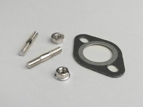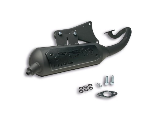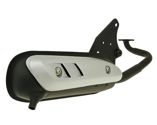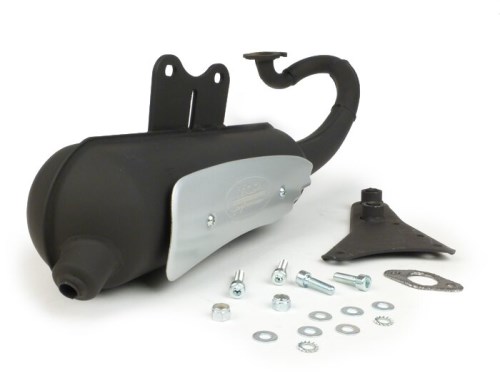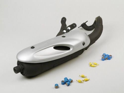 Aus Feinstahlblech, mit 1,5mm Stärke, im Pressverfahren hergestellter Auspuff. Prallbleche im Schalldämpfer zur Geräuschreduzierung. Vibationsgedämpfte Halteplatte aus Metall. Wiederbefüllbarer Aluminium-Endschalldämpfer. Bitte beachten: Nachrüstanlagen haben im Regelfall immer mehr Leistung als der originale Auspuff. Um eine Zulassung zu erhalten, werden sie werkseitig gedrosselt, womit eine Verschiebung des Leistungsbandes einhergehen kann. Damit der Roller seine volle Leistung und Geschwindigkeit erreicht, ist daher eventuell eine Anpassung des Motors auf den neuen Auspuff mit anderen Variatorgewichten, Kupplungsfedern und/oder Vergaserbedüsung notwendig, auch wenn dieser gedrosselt auf einem Serienmotor verwendet werden soll.