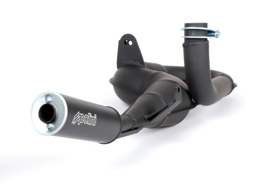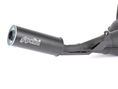 Con la Polini per le Vespa a telaio grande si prende una buona decisione di scarico. I buoni valori di performance sono abbinati ad un prezzo eccellente. Come per lo scarico Simonini, la coppia nella gamma bassa non è paragonabile ai sistemi di scarico da corsa inglesi. Ma nel mezzo c'è molto vapore e la Polini gira liberamente verso l'alto. Così la Polini realizza un'alta velocità massima anche con un rapporto di trasmissione corto. Soprattutto a partire dai 166 cc in su la Polini fa una bella e ampia gamma di velocità per quel certo calcio in più. Da fermo lo scarico suona un po' metallico, ma con l'aumentare dei giri il suono diventa davvero seghettato. Conclusione: tipico italiano, che scompare poco appariscente sotto il motore grazie al silenziatore piuttosto piccolo . Senza approvazione AI-translation