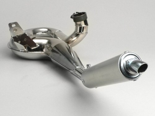 Il Simonini è un classico rappresentante dei sistemi di scarico delle presse per lo stagno italiane. La costruzione semplice e il metodo di fabbricazione favorevole (due gusci di lamiera sovrapposti) lo rendono interessante nel prezzo. Lo scarico è progettato come un cosiddetto braccio destro. Ciò significa che è posizionato sotto il motore e la marmitta sporge nella parte posteriore destra del veicolo. Le sue caratteristiche prestazionali sono relativamente simili a quelle di un buon scarico per scatole come il BigBox Touring. PRO Poco invadente Ruota posteriore facilmente accessibile Molto silenzioso nel funzionamento a carico parziale Caratteristiche di prestazione adatte all'uso quotidiano CONTRA Complica l'accesso alle viti di regolazione del cavo della frizione e del freno posteriore Più peso sul lato del motore già pesante Relativamente rumoroso al minimo Qualità solo sufficiente AI-translation