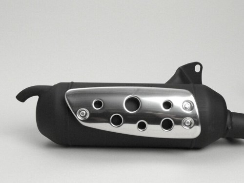 Il Silent Pro è la scelta giusta per tutti coloro che sono alla ricerca di un sistema di scarico sportivo molto discreto. Con il Silent Pro il nome dice tutto, uno scarico molto silenzioso con un significativo aumento della velocità massima. Grazie alla sua gamma di velocità molto ampia è molto facile da sintonizzare su motori da 50ccm e domare motori da 70ccm. Si prega di notare: I sistemi di retrofit di solito hanno sempre una potenza maggiore rispetto allo scarico originale. Per ottenere un'approvazione, vengono strozzati in fabbrica, il che può causare uno spostamento della banda di potenza. Affinché lo scooter possa raggiungere la sua piena potenza e velocità, può quindi essere necessario adattare il motore al nuovo scarico con altri pesi del variatore e/o molle della frizione, anche se queste ultime devono essere utilizzate strozzate su un motore di produzione. AI-translation