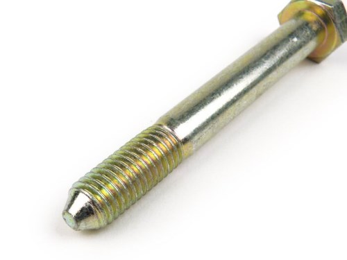 Vite Piaggio originale con estremità filettata "a punta". Con questo si può colpire meglio il dado quadrato allentato sulla marmitta e il montaggio è molto più veloce che con una vite M10 convenzionale. AI-translation