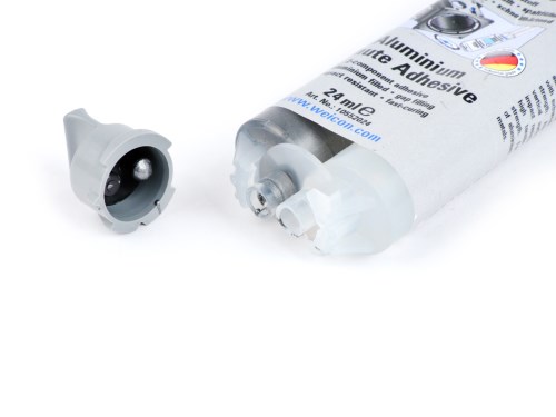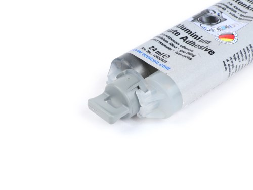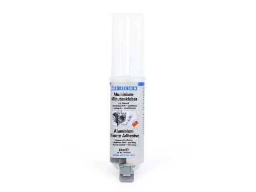 WEICON Aluminium Minute Adhesive è un adesivo epossidico bicomponente a basso odore, riempito di alluminio. Polimerizza rapidamente e praticamente senza restringersi a temperatura ambiente. Dopo l'indurimento, l'adesivo può essere lavorato meccanicamente (limatura, foratura, fresatura). L'adesivo Minute Adesivo Alluminio è resistente al gap-filling e al run-off (tissotropico) ed ha una resistenza molto elevata alla trazione, all'impatto e alla pelatura. L'adesivo è particolarmente adatto per l'incollaggio di alluminio e altri metalli leggeri tra di loro. Viene utilizzato per riempire crepe e fori, ad esempio negli alloggiamenti in alluminio, e può essere usato per riparare cerchi in lega leggera. Per ottenere un'adesione ottimale, le superfici da incollare devono essere asciutte e prive di grasso o sporco. Raschiare o smerigliare le superfici prima della pulizia aiuta a garantire una buona adesione. AI-translation