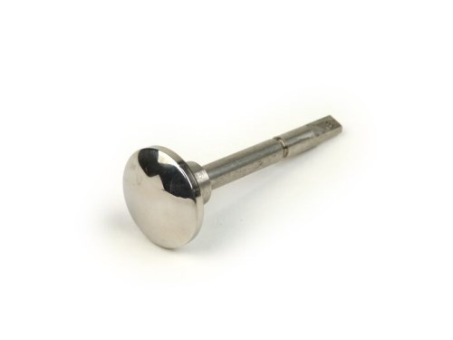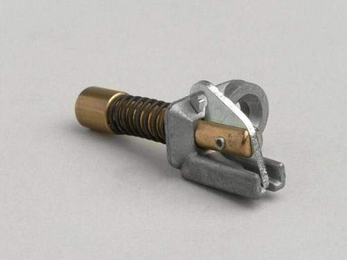 Set completo di tre parti della leva dell'induttanza che contiene tutte le parti del meccanismo dell'induttanza che non sono montate sul telaio. Contiene la manopola di azionamento e il piccolo morsetto a filo che funge da contro-cuscinetto per il cavo dell'induttanza, nonché il morsetto che blocca leggermente la manopola e consente un posizionamento continuo. Può essere utilizzato in tutti i vespe a telaio di grandi dimensioni con carburatori SI e con il comando dello starter situato direttamente sopra la leva del rubinetto del carburante. Tra le altre cose, è appropriato: PX T5 Sprint Rally SS 180 GS 160 GT GTR TS Super GL VNA NBB VBA VBB AI-translation